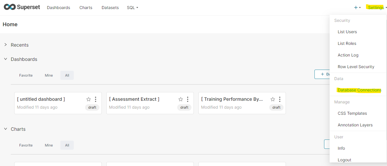 3. Once pydruid is installed, navigate to settings and click on database connections