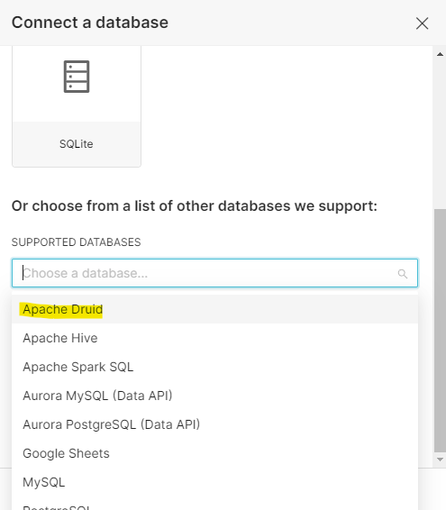 4. Click on Add Database and select Apache Druid as shown in the screenshot below: