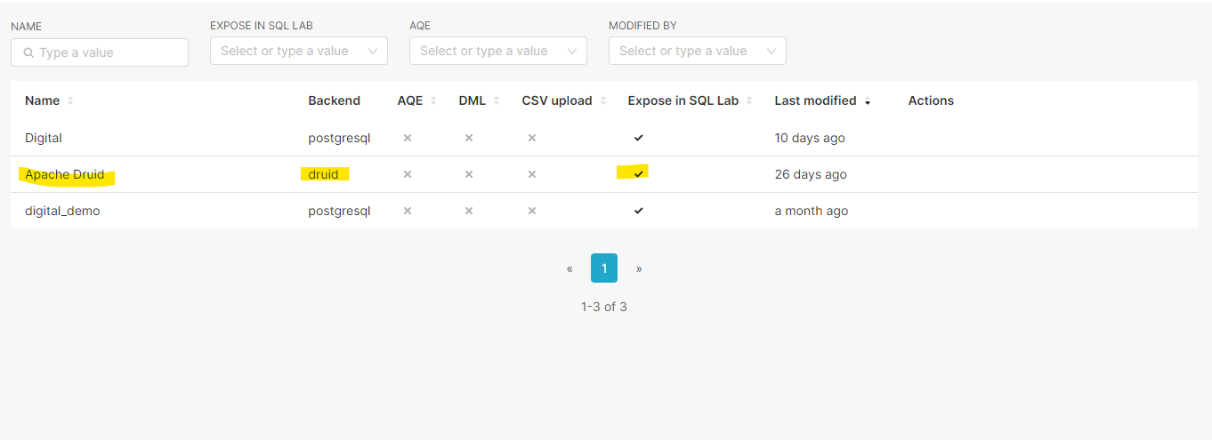 Note: druid://<User>:<password>@<Host>:<Port-default-9088>/druid/v2/sql According to the Alchemy URI “<Port-default-9088>” the default ports will be “8888” or “8081”. If the druid you have installed is running on http without any secure connection the Alchemy URI with the above rule will work without any issue. Ex: druid://localhost:8888/druid/v2/sql/ If you have a secure connection normally druid://localhost:8888/druid/v2/sql/ will not work and provide an error. Here we will understand that we have to provide a domain name instead of localhost if we have enabled a secured connection for the druid UI. So we will make the changes and enter the URI as below druid://domain.name.com:8888/druid/v2/sql/. This will also not work. According to other sources we have to make the changes like druid+https://localhost:8888/druid/v2/sql/ OR druid+https://localhost:8888/druid/v2/sql/?ssl_verify=false Neither of them will work Normally once we enable a secured connection port HTTPS will be enabled to the site proxying the default ports of any of the other applications. So if we enter the below SQL ALCHEMY URI as below druid+https://domain.name.com:443/druid/v2/sql/?ssl=true Superset will understand that the druid is enabled with a secured connection and running in the HTTPS port. |