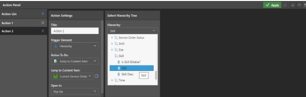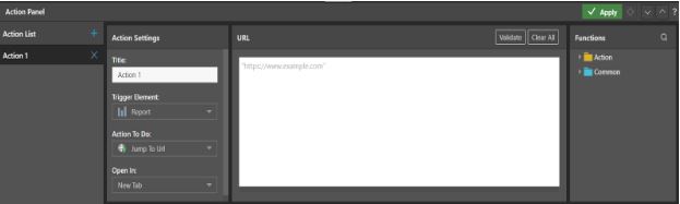 Configure actions: An action can be used to open a particular content item or URL. To do this, we can set “ Action 1 “ with default settings. One-click on this would initiate an action that will lead you to a particular URL, provided the URL is written on the given area. To set the action, click on the “ Apply” button.